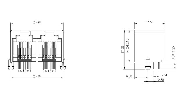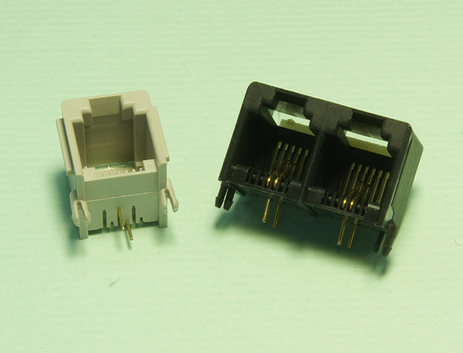 Modular Jack, RJ11, 1*2 ports Contacts: 6P6C / 6P4C / 6P2C Tab up, without panel stops, through hole, side entry
